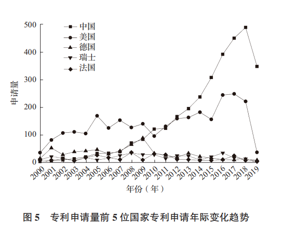 圖5 展示了 2000-2019 年專利申請(qǐng)量居于世界前 5 位國(guó)家的專利申請(qǐng)趨勢(shì)。中國(guó)的專利申請(qǐng)量連年上升,且在 2010 年超越美國(guó),成為專利申請(qǐng)量最多的國(guó)家。排名第二的美國(guó)起點(diǎn)最高,在 2010年之前一直處于領(lǐng)先地位,之后逐漸被中國(guó)反超,美國(guó)的專利申請(qǐng)趨勢(shì)波動(dòng)幅度較大,但仍呈上升趨勢(shì)。排名位于第三的德國(guó)在 2009 年達(dá)到高峰之后開(kāi)始呈現(xiàn)波動(dòng)下降趨勢(shì)。排名位于第四、第五的瑞士和法國(guó),發(fā)展趨勢(shì)比較平緩,有小幅度波動(dòng)。表明該技術(shù)在中美兩個(gè)農(nóng)業(yè)大國(guó)的市場(chǎng)前景廣闊,中美是目前全球分子標(biāo)記輔助育種技術(shù)創(chuàng)新的主力軍。