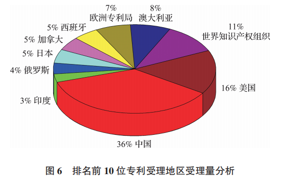 其中,全球受理專利申請(qǐng)排名前 10 位國(guó)家或地區(qū)專利局分別為中國(guó)、美國(guó)、世界知識(shí)產(chǎn)權(quán)組織、澳大利亞、歐洲專利局、西班牙、加拿大、日本、俄羅斯和印度。中國(guó)近年在國(guó)家項(xiàng)目的大力支持下,在分子標(biāo)記輔助育種應(yīng)用方面的研究發(fā)展迅猛。目前已在水稻、小麥、玉米、大豆和油菜等主要作物中鑒定了一批與關(guān)鍵性狀緊密連鎖的分子標(biāo)記,在選育后代的技術(shù)上取得一系列重大突破。由圖 6 可見(jiàn),中國(guó)受理了 3261 件專利,占前 10 位受理地區(qū)專利受理總量的 36%,與專利申請(qǐng)量趨平,表示中國(guó)分子標(biāo)記輔助育種技術(shù)的“引進(jìn)來(lái)”與“走出去”相當(dāng)。美國(guó)在分子標(biāo)記輔助育種技術(shù)創(chuàng)新上亦取得系列成果,其專利受理量為 1403 件,占前 10 位受理地區(qū)專利受理總量的 16%,專利申請(qǐng)量比受理量高出 19%,充分體現(xiàn)美國(guó)是分子標(biāo)記輔助育種的技術(shù)“輸出國(guó)”。作為全球?qū)@季值闹匾獦屑~,世界知識(shí)產(chǎn)權(quán)組織在專利技術(shù)全球化應(yīng)用中起著重要作用,分子標(biāo)記輔助育種相關(guān)專利在世界知識(shí)產(chǎn)權(quán)組織的受理量為 954 件,占前 10 位受理地區(qū)專利受理總量的 11%,反應(yīng)了該技術(shù)的國(guó)際共享度和活躍度。