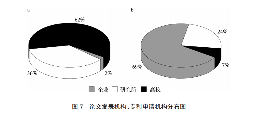 2.4 論文發(fā)表與專利申請(qǐng)的研發(fā)機(jī)構(gòu)競(jìng)爭(zhēng)力分析 在發(fā)表關(guān)于分子標(biāo)記輔助育種的論文中,論文發(fā)表量排名前 10 位的研發(fā)機(jī)構(gòu)均為高校和科研院所。根據(jù)圖 7a 統(tǒng)計(jì)可知:高校的論文發(fā)表量為 6462 篇,占發(fā)表總量的 62% ;其次為研究所,發(fā)表論文 3787篇,占發(fā)表總量的 36% ;企業(yè)發(fā)表數(shù)量最少,為 189篇,占發(fā)表總量的 2%。通過(guò)論文發(fā)表量可知,理論研究的熱點(diǎn)機(jī)構(gòu)主要為高校與科研院所,亦是基礎(chǔ)研究的中堅(jiān)力量。在分子標(biāo)記輔助育種專利申請(qǐng)方面,由圖 7b 可知:在排名靠前的機(jī)構(gòu)中企業(yè)數(shù)量最多,申請(qǐng)的專利數(shù)量為 9698 件,在所有機(jī)構(gòu)中占比 69% ;其次是研究所,數(shù)量為 3325 件,占比 24% ;高校專利申請(qǐng)數(shù)量最少,為 1043 件,占比 7%,同樣,在專利申請(qǐng)過(guò)程中各機(jī)構(gòu)之間也存在合作情況。通過(guò)專利申請(qǐng)量可知,企業(yè)主要側(cè)重保護(hù)知識(shí)產(chǎn)權(quán)用以開(kāi)拓技術(shù)應(yīng)用市場(chǎng)。