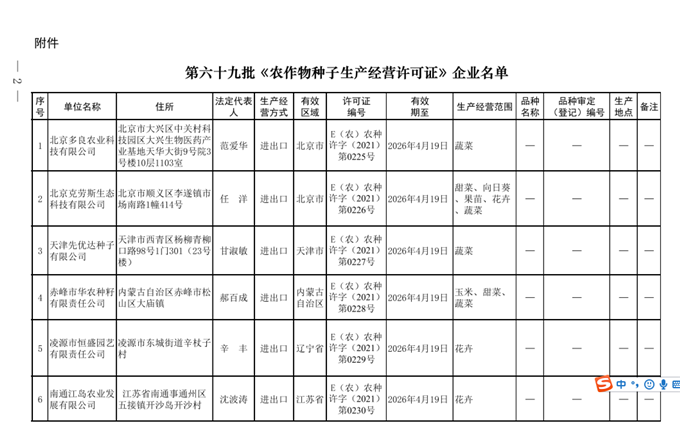 附件:第六十九批《農(nóng)作物種子生產(chǎn)經(jīng)營許可證》企業(yè)名單