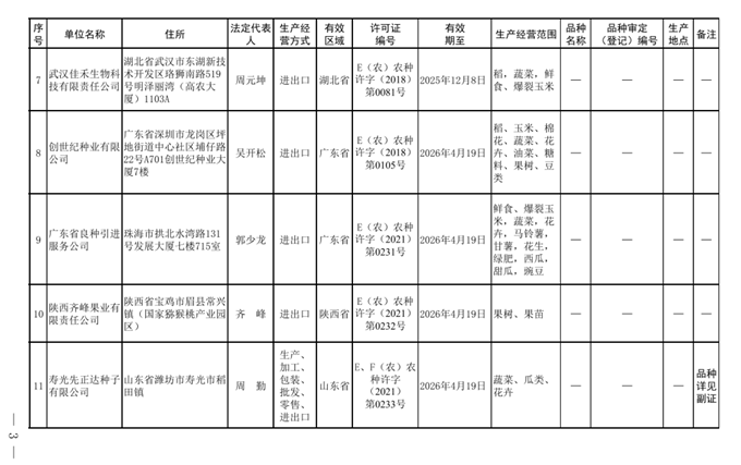公司等11家企業(yè)《農(nóng)作物種子生產(chǎn)經(jīng)營許可證》(詳見附件)。