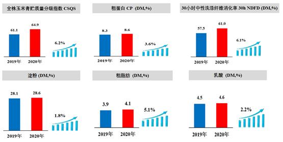 報告顯示,按照全株玉米青貯質(zhì)量分級指數(shù)(CSQS)評價,2020年我國CSQS平均值為64.9分,同比提高6.2%,30小時中性洗滌纖維消化率、淀粉含量和乳酸含量平均值比2019年分別提高了6.1%、1.8%和2.2%。糧改飼試點地區(qū)90%以上全株玉米青貯質(zhì)量達到良好水平,比2019年提高5個百分點,其中17.5%達到優(yōu)秀水平,比2019年提高8.5個百分點。