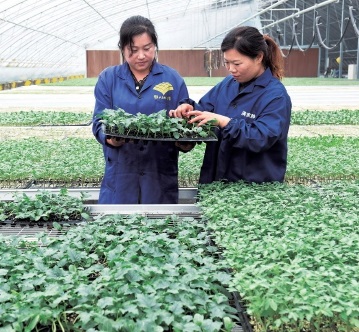 圖為江蘇省連云港市東??h桃林鎮(zhèn)北芹蔬菜育苗基地“新產(chǎn)業(yè)工人”正在智能化大棚里為蔬菜種苗清除雜株。