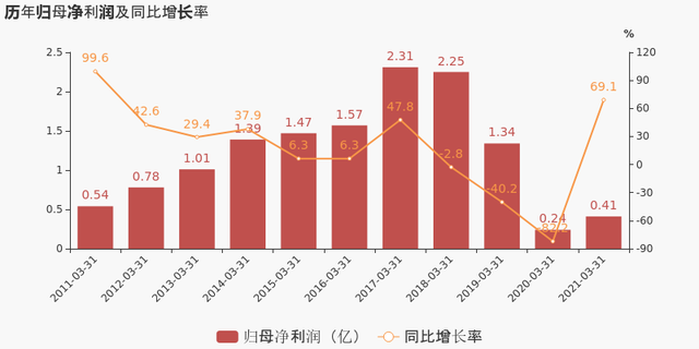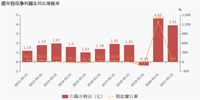 2021年一季度歸母凈利潤為3.9億元,同比下降16%
