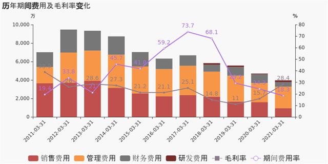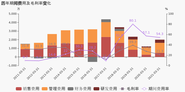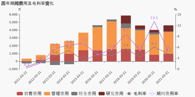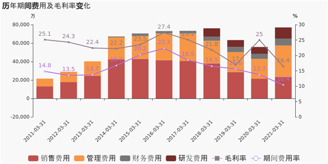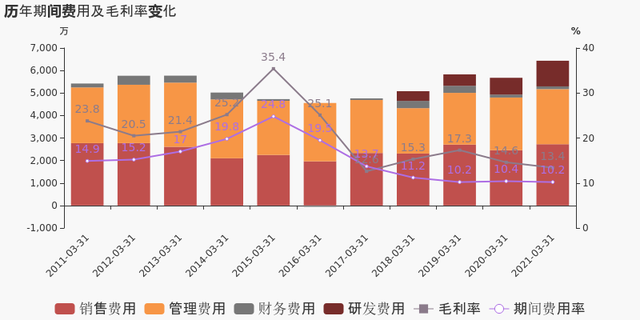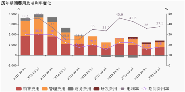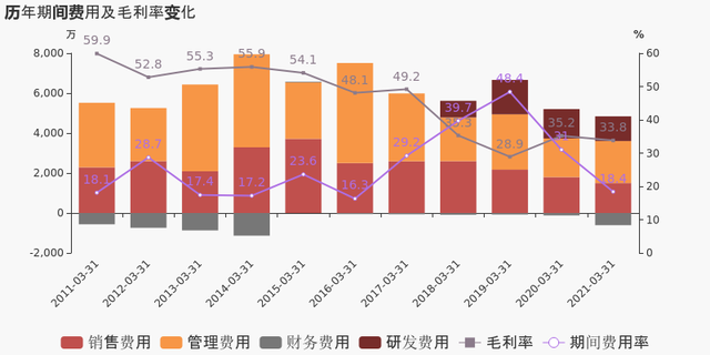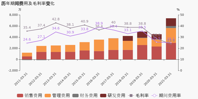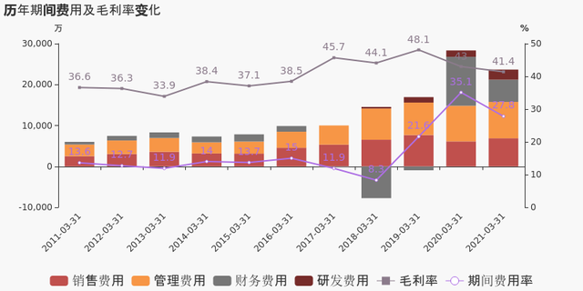 期間費用大幅上升,營業(yè)成本大幅上升。公司2021一季度營業(yè)成本2.2億,同比增長77.3%,高于營業(yè)收入66.1%的增速,導(dǎo)致毛利率下降4.8%。期間費用率為25.1%,同去年相比變化不大。