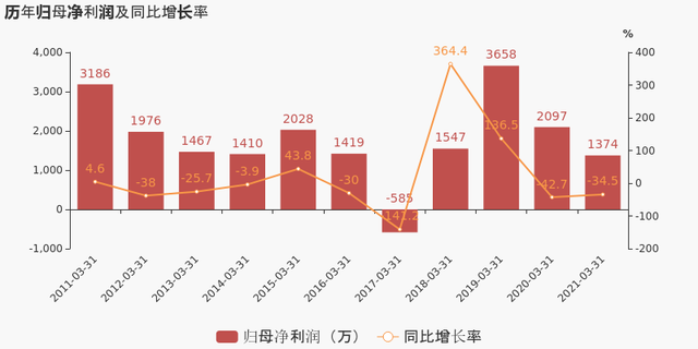 2021年一季度歸母凈利潤為1374萬元,同比下降34.5%