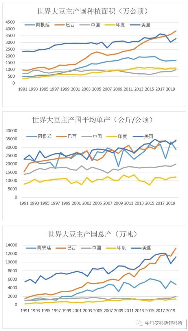 圖3:世界大豆主產(chǎn)國(guó)大豆種植面積、單產(chǎn)與總產(chǎn)