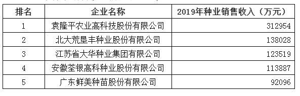 根據(jù)全國農(nóng)技中心公布的2019年數(shù)據(jù)來看,2019年全國種子銷售收入超過1億元的企業(yè)110家,超過2億元的35家,超過5億元的9家,超過10億元的3家,超過20億元的1家。江蘇省大華種業(yè)集團有限公司和安徽荃銀高科種業(yè)股份有限公司進入銷售收入前五名。