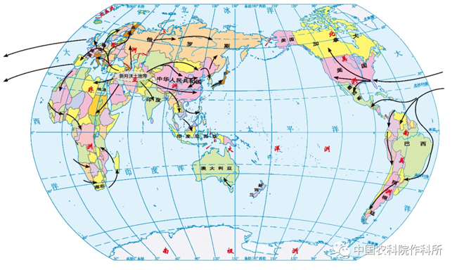 小麥起源于公元前9600年的西亞新月沃地區(qū)(包括以色列、巴勒斯坦、黎巴嫩、約旦、敘利亞、伊拉克東北部和土耳其東南部)。作為人類最早采集、食用、儲(chǔ)存的谷物,小麥大約在5000年前被馴化為栽培作物,傳入歐洲和非洲,并逐漸引種到世界各地(圖2),成為世界約40%人口的主糧。