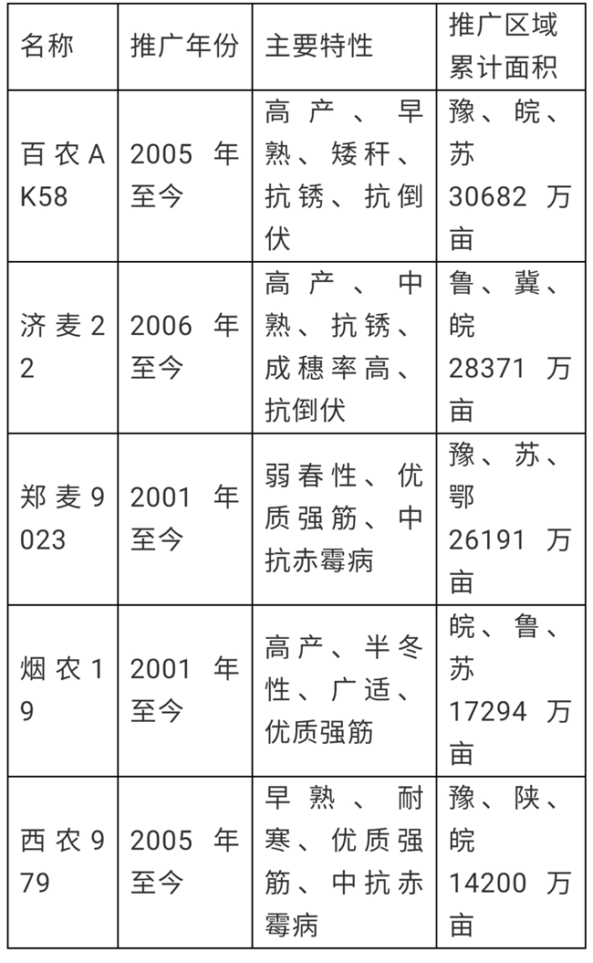 表1 近年來推廣面積最大的前5個(gè)小麥品種