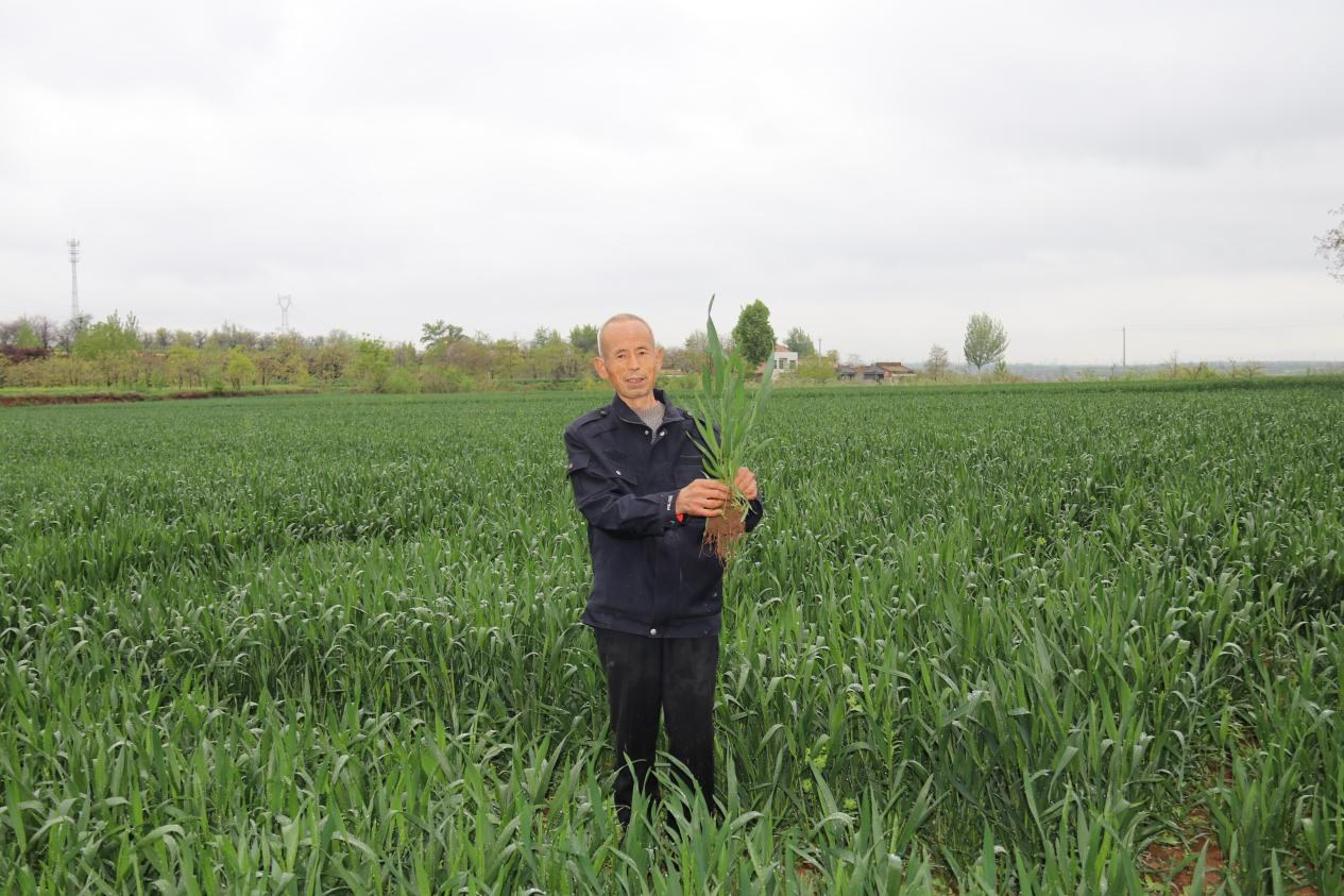 馬光佐正在麥田查看小麥長勢(shì)