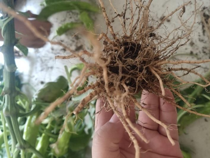 根部病害,一般病程較長,發(fā)病初期不易發(fā)現(xiàn)。發(fā)病初期,棚內(nèi)通常只有少數(shù)植株發(fā)病,發(fā)病植株地上部分僅中午輕度萎蔫,早晚恢復(fù),持續(xù)一周左右,嚴(yán)重者會出現(xiàn)死棵。菜農(nóng)在管理過程中,若不能及時發(fā)現(xiàn)病株并有效處理,病害就會通過澆水等人為操作造成大面積傳播。