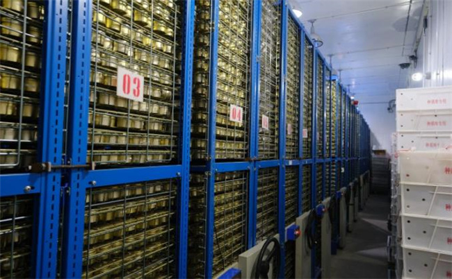 再打開一扇門,這才算正式進入到冷庫。一排排4米多高的深藍色架子緊密排列,近乎將整個庫房的空間占據(jù),每個架子的每一層里密密麻麻存放著一個個圓形的金黃色小盒子。這些盒子里面,就裝著中國最珍貴的“戰(zhàn)略資源”。盒子的上面都貼著一張標(biāo)簽,標(biāo)簽上的一串編碼正是種子的身份證號。