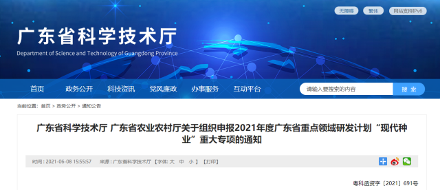6月8日,廣東省科學(xué)技術(shù)廳、廣東省農(nóng)業(yè)農(nóng)村廳下發(fā)關(guān)于組織申報(bào)2021年度廣東省重點(diǎn)領(lǐng)域研發(fā)計(jì)劃“現(xiàn)代種業(yè)”重大專項(xiàng)的通知,標(biāo)志著2021年度廣東省“現(xiàn)代種業(yè)”重大專項(xiàng)(以下簡(jiǎn)稱“專項(xiàng)”)申報(bào)正式開(kāi)始。