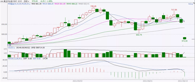 CBOT玉米主連價格6月15日下跌超12%,盤中最低572美分/蒲式耳,接近4月中旬以來的最低水平。