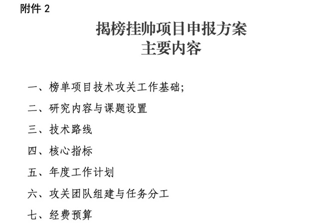 (2)揭榜單位根據(jù)榜單項(xiàng)目需求表細(xì)化落實(shí)相關(guān)內(nèi)容要求,提交揭榜掛帥項(xiàng)目申報(bào)方案(主要內(nèi)容見(jiàn)附件2)。