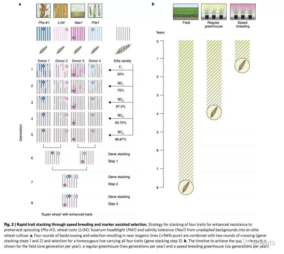 精心的策劃可用于創(chuàng)建DNA分子標(biāo)記測試、快速育種和田間表現(xiàn)評估的研發(fā)線。第一個使用快速育種開發(fā)的春小麥品種“DS Faraday”于2017年在澳大利亞發(fā)布。在這個產(chǎn)品中,快速育種被用于在作物成熟時加速籽粒中抑制發(fā)芽的休眠基因的轉(zhuǎn)育,以產(chǎn)生對采前發(fā)芽的耐受性提高的高蛋白質(zhì)的面粉小麥。