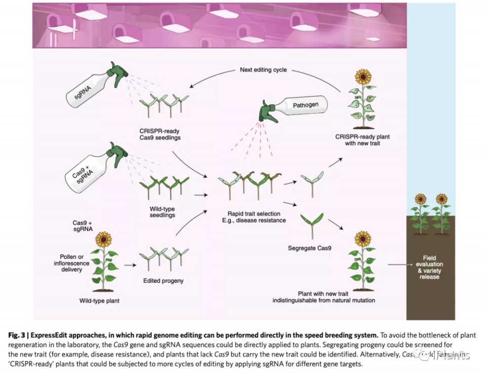 對于基因編輯和轉(zhuǎn)基因性狀而言,可以通過將這些工具納入快速育種研發(fā)線而更快地實(shí)現(xiàn)其優(yōu)勢。許多第一代基因編輯應(yīng)用都僅僅依賴于一種或兩種非優(yōu)良基因型,它們的優(yōu)點(diǎn)在于容易進(jìn)行植物組織培養(yǎng)和轉(zhuǎn)化后再生。最近開發(fā)的技術(shù)甚至可以也為優(yōu)良品系提供高的轉(zhuǎn)化效率。實(shí)施基因編輯仍然需要耗費(fèi)時間的組織培養(yǎng)過程,以及適合進(jìn)行Cas9基因和單指導(dǎo)RNA(sgRNA)序列遺傳操作的具有一定程度物理控制的專業(yè)實(shí)驗(yàn)室。然而,將基因編輯直接納入快速育種的系統(tǒng),如ExpressEdit,有可能繞過植物材料體外操作的技術(shù)瓶頸。雖然并未常規(guī)操作,但如下所述已經(jīng)采取了許多朝向基因編輯快速跟蹤發(fā)展的舉措。在CRISPR基因編輯中,sgRNA指導(dǎo)Cas9酶定位到靶標(biāo)DNA位點(diǎn)上,Cas9在該位點(diǎn)切割DNA??梢援a(chǎn)生含有異源Cas9基因的“CRISPRready”基因型。例如,含有Cas9轉(zhuǎn)基因的轉(zhuǎn)化植物可以作為供體,利用高速分子標(biāo)記輔助回交轉(zhuǎn)育來創(chuàng)造一系列的優(yōu)良自交系。如下所述,為達(dá)成靶向基因組編輯,有不同的遞送sgRNA的不同方式。然而,這種技術(shù)仍將產(chǎn)生需要接受監(jiān)管的轉(zhuǎn)基因植物,并且將需要提供轉(zhuǎn)基因、Cas9以及大多數(shù)情況下的選擇標(biāo)記基因的被編輯基因座在隨后的分離情況?;蚪M編輯與無需組織培養(yǎng)的快速育種的整合需要一些技術(shù)上的突破,其最佳結(jié)果是進(jìn)行等位基因修飾而不需要組織培養(yǎng)或應(yīng)用外源DNA,因?yàn)檫@樣的結(jié)果可以避免被貼上轉(zhuǎn)基因生物的標(biāo)簽。單個或多重編輯已被廣泛證實(shí)能夠?qū)崿F(xiàn)這一期望,而現(xiàn)在,可以使用以下無組織培養(yǎng)技術(shù)來實(shí)現(xiàn)。