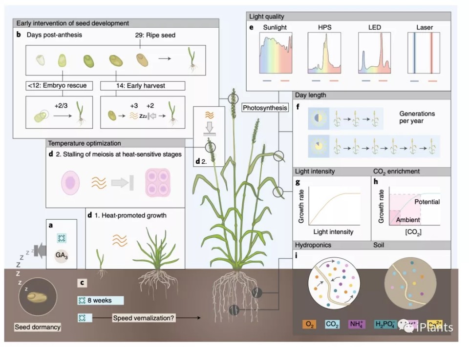 根據(jù)使用的目標(biāo)(快速生長周期、快速雜交或快速表型分析)和植物種類,需要對參數(shù)進(jìn)行權(quán)衡優(yōu)化。例如,Zeng等人在80立方厘米的小型植物生長井中植物施加水分脅迫,他們得出的研究結(jié)果是,預(yù)計每年可生產(chǎn)8代小麥,但每株小麥的種子產(chǎn)量只有兩到三粒。
