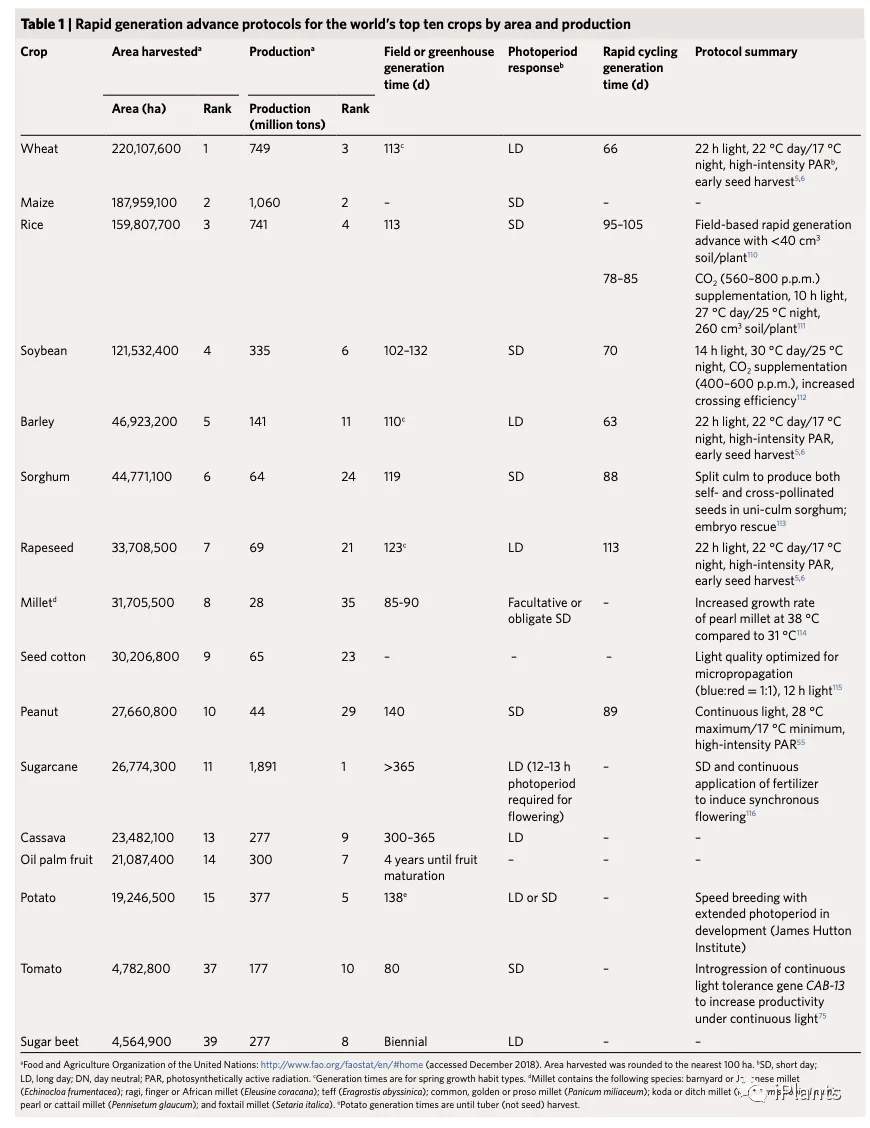 不同于12000多年前第一批糧食作物被馴化的時代,今天的植物育種家擁有大量的創(chuàng)新技術(shù)可用于作物改良(圖1和補(bǔ)充表1)。例如,自動化高通量表型分析系統(tǒng)的發(fā)展已經(jīng)實(shí)現(xiàn)了對較大群體的快速評估,增加了選擇強(qiáng)度并提高了選擇準(zhǔn)確性。第二代和第三代的測序平臺出現(xiàn)意味著育種家們可以較低成本使用DNA分子標(biāo)記來輔助篩選并加速基因挖掘、性狀解析和預(yù)測育種技術(shù)。植物育種的關(guān)鍵限制因素之一是作物生長周期長,通常每年只產(chǎn)生一代或兩代,這一難題已經(jīng)通過使用“快速育種”方案得以部分解決,這種方案采用延長的光周期并控制溫度,將春小麥、大麥、鷹嘴豆和油菜的傳代時間縮短一半以上。最先進(jìn)的技術(shù)與快速育種相結(jié)合,將為應(yīng)對養(yǎng)育100億人口挑戰(zhàn)的努力夯實(shí)基礎(chǔ)。