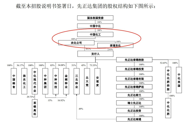 先正達集團實控人是國務(wù)院國資委,由今年5月剛剛合并重組成立的中國中化間接控股,中國化工旗下農(nóng)化公司控股。農(nóng)化公司直接持有先正達99.1%股份,為控股股東,同時農(nóng)化公司的全資子公司麥道農(nóng)化持有0.9%股份。根據(jù)此前媒體報道,2017年中國化工完成收購全球第一大農(nóng)藥、第三大種子巨頭先正達(Syngenta),以430億美元的價格創(chuàng)造了中企并購的世界紀錄。先正達上市應(yīng)該是今年5月中國中化揭牌成立以來第一件大事。