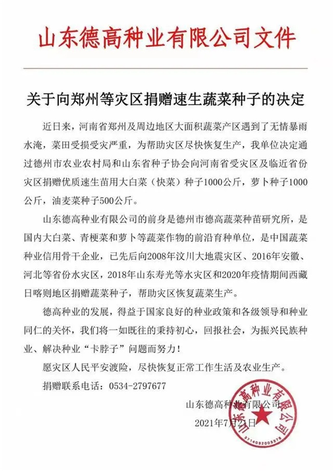 山東德高種業(yè)有限公司的前身是德州市德高蔬菜種苗研究所,是國內(nèi)大白菜、青梗菜和蘿卜等蔬菜作物的前沿育種單位,是中國蔬菜種業(yè)信用骨干企業(yè),已先后向2008年汶川大地震災(zāi)區(qū)、2016年安徽、河北等省份水災(zāi)區(qū),2018年山東壽光等水災(zāi)區(qū)和2020年疫情期間西藏日喀則地區(qū)捐贈蔬菜種子,幫助災(zāi)區(qū)恢復(fù)蔬菜生產(chǎn)。