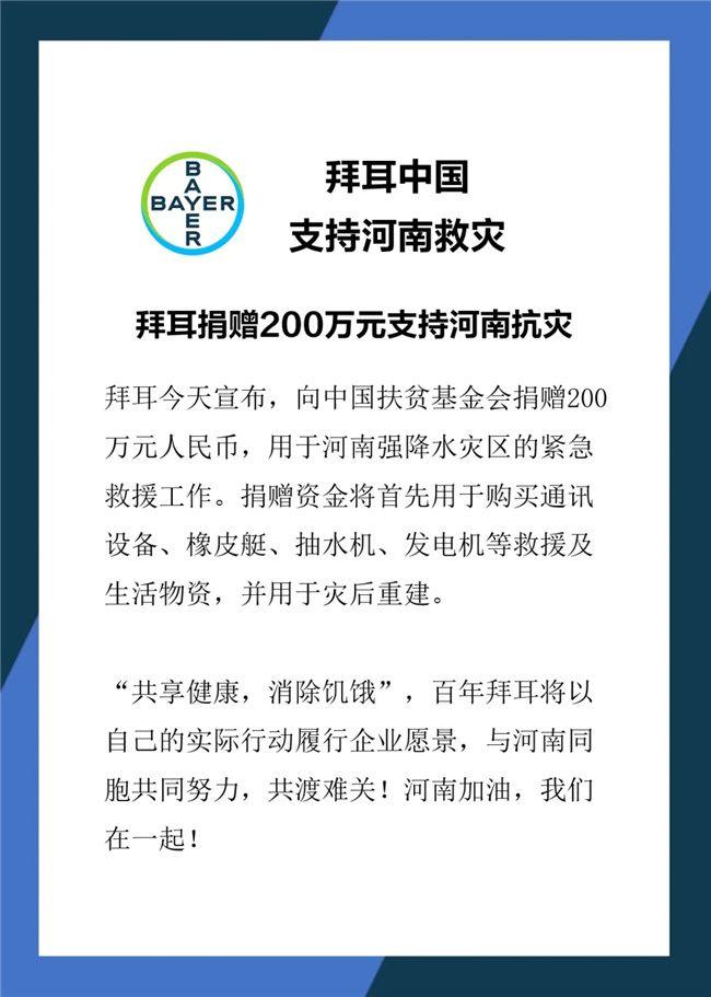 7月22日,拜耳宣布向中國扶貧基金會捐贈200萬元,用于河南強降水災(zāi)區(qū)的緊急救援工作。捐贈資金將首先用于購買通訊設(shè)備、橡皮艇、抽水機、飲用水、發(fā)電機、救生衣等救援物資與裝備以及食品等生活物資,并用于災(zāi)后重建。