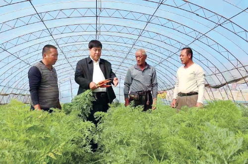 十里村黨總支書(shū)記馬春利(左二)在棚內(nèi)向村民講解胡蘿卜種植技術(shù)?!≠Y料圖