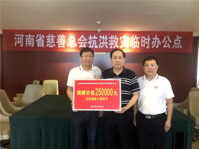 7月26日,在河南省慈善總會,河南金苑種業(yè)股份有限公司常務副總經(jīng)理陳海見(左一)、營銷中心副總經(jīng)理馬文周(右一),向河南省慈善總會鄭重遞上“價值25萬元的優(yōu)質(zhì)強筋小麥種子”捐贈承諾。