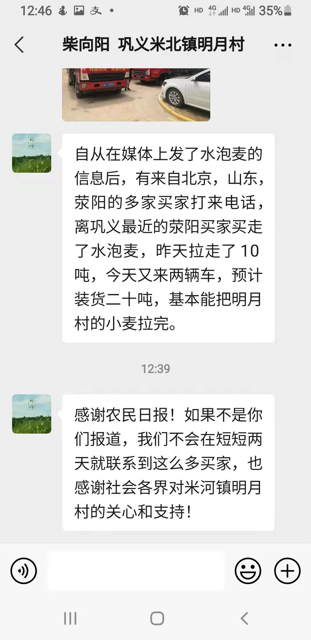 明月新村駐村第一書(shū)記柴向陽(yáng)28日微信本報(bào)記者,“自從在媒體上發(fā)了水泡麥的信息后,有來(lái)自北京,山東,滎陽(yáng)的多家買(mǎi)家打來(lái)電話(huà),離鞏義最近的滎陽(yáng)買(mǎi)家買(mǎi)走了水泡麥,昨天拉走了10噸,今天又來(lái)兩輛車(chē),預(yù)計(jì)裝貨二十噸,基本能把明月村的小麥拉完。”