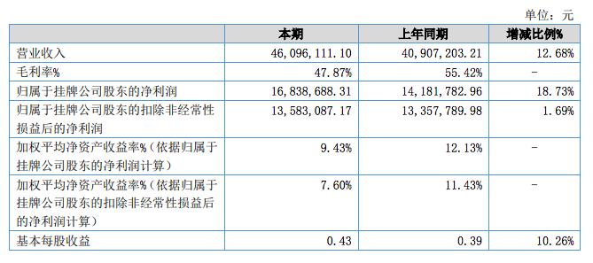 8月11日,康農(nóng)種業(yè)(837403)近日發(fā)布2021年半年度報告,報告期內(nèi)公司實現(xiàn)營業(yè)收入46,096,111.10元,同比增長12.68%;歸屬于掛牌公司股東的凈利潤16,838,688.31元,同比增長18.73%。