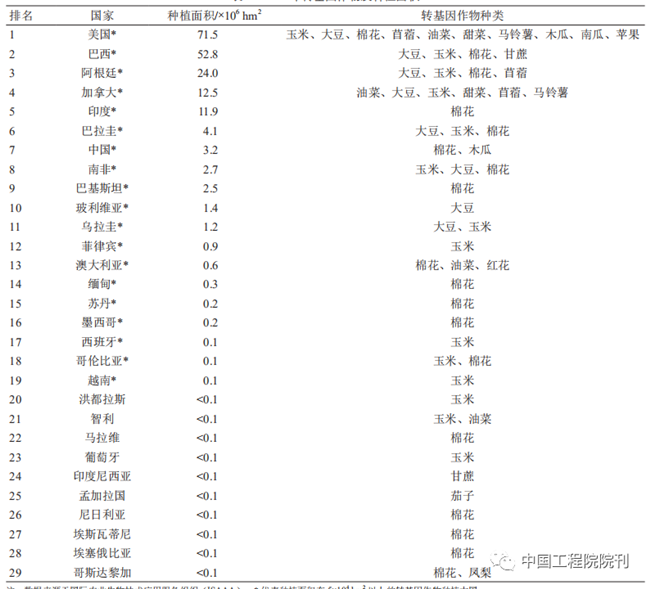注:數(shù)據(jù)來源于國(guó)際農(nóng)業(yè)生物技術(shù)應(yīng)用服務(wù)組織(ISAAA),* 代表種植面積在 5×104 公頃以上的轉(zhuǎn)基因作物種植大國(guó)。