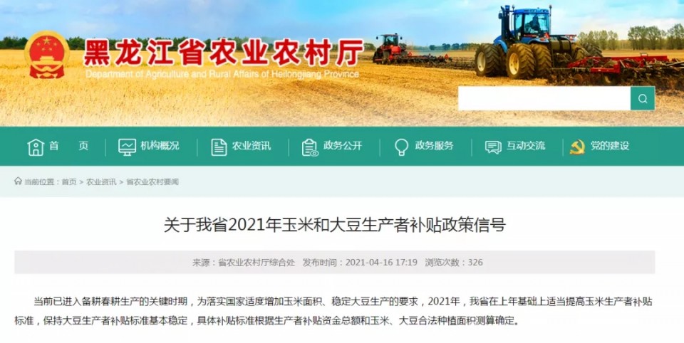 作為我國重要的糧食主產(chǎn)區(qū),黑龍江堅決當(dāng)好維護(hù)國家糧食安全“壓艙石”。為落實國家適度增加玉米面積、穩(wěn)定大豆生產(chǎn)的要求,今年4月,釋放出政策信號,在上年基礎(chǔ)上適當(dāng)提高玉米生產(chǎn)者補貼標(biāo)準(zhǔn),保持大豆生產(chǎn)者補貼標(biāo)準(zhǔn)基本穩(wěn)定。