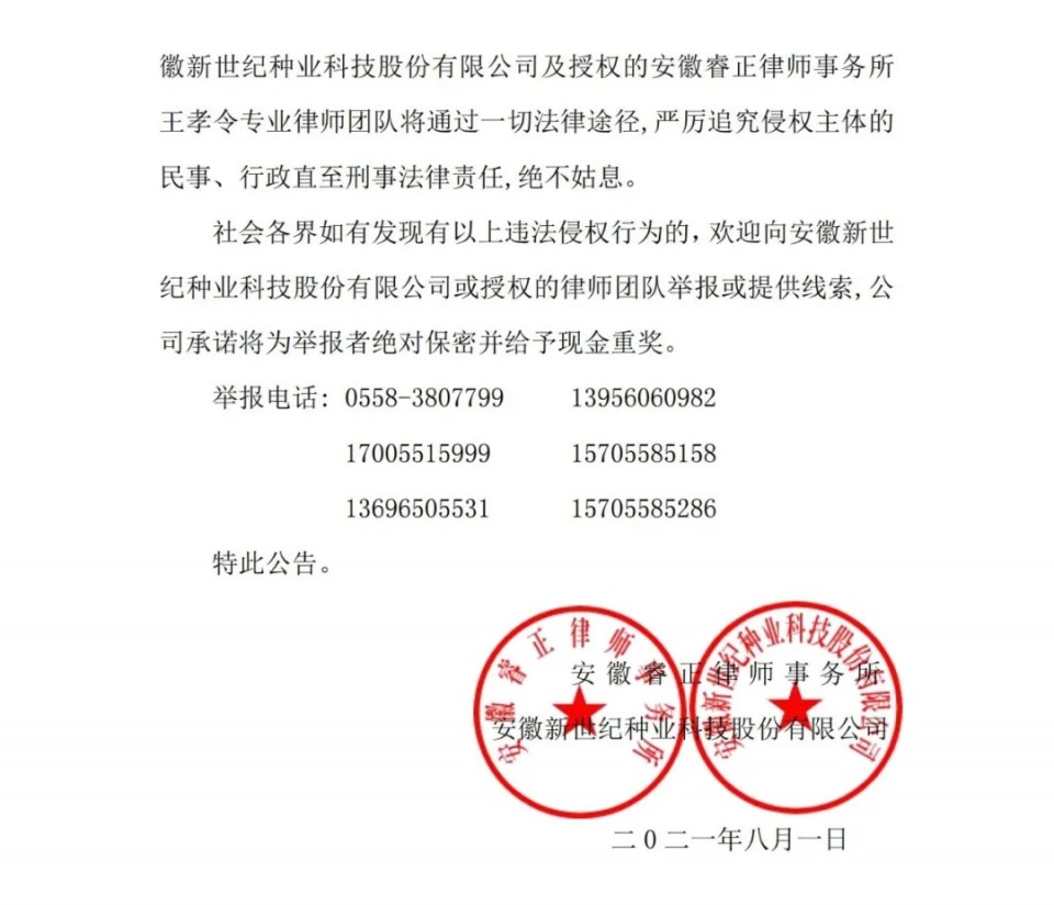 社會各界如有發(fā)現(xiàn)有以上違法侵權(quán)行為的,歡迎向安徽新世紀(jì)種業(yè)科技股份有限公司或授權(quán)的律師團(tuán)隊舉報或提供線索,公司承諾將為舉報者絕對保密并給予現(xiàn)金重獎。