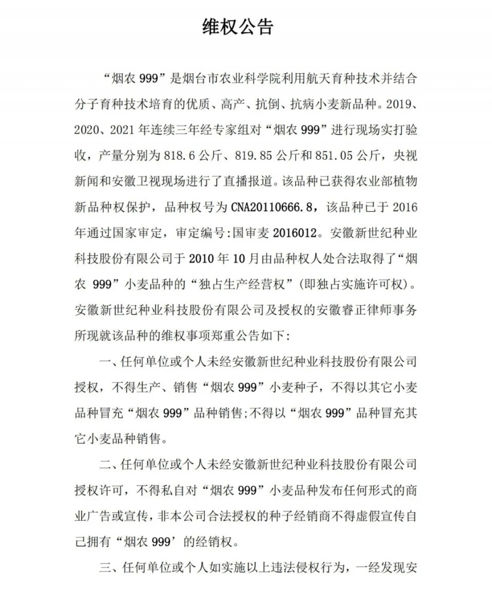 “煙農(nóng)999”是煙臺市農(nóng)業(yè)科學(xué)院利用航天育種技術(shù)并結(jié)合分子育種技術(shù)培育的優(yōu)質(zhì)、高產(chǎn)、抗倒、抗病小麥新品種。2019、2020、2021年連續(xù)三年經(jīng)專家組對“煙農(nóng)999”進(jìn)行現(xiàn)場實(shí)打驗(yàn)收,產(chǎn)量分別為818.6公斤、819.85公斤和851.05公斤,央視新聞和安徽衛(wèi)視現(xiàn)場進(jìn)行了直播報道。該品種已獲得農(nóng)業(yè)部植物新品種權(quán)保護(hù),品種權(quán)號為CNA20110666.8,該品種已于2016年通過國家審定,審定編號:國審麥2016012。安徽新世紀(jì)種業(yè)科技股份有限公司于2010年10月由品種權(quán)人處合法取得了“煙農(nóng) 999”小麥品種的“獨(dú)占生產(chǎn)經(jīng)營權(quán)”(即獨(dú)占實(shí)施許可權(quán))。安徽新世紀(jì)種業(yè)科技股份有限公司及授權(quán)的安徽睿正律師事務(wù)所現(xiàn)就該品種的維權(quán)事項(xiàng)鄭重公告如下: