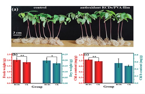 研究團隊提出了對應(yīng)的抗氧化策略,獲得了抗拉伸性能良好且具有抗氧化能力的抗氧化RCDs/PVA轉(zhuǎn)光膜,實現(xiàn)了黃綠光向紅光的轉(zhuǎn)光。與空白薄膜相比,該RCDs/PVA薄膜能促進綠豆芽生長。實驗結(jié)果表明,經(jīng)該轉(zhuǎn)光薄膜處理的綠豆芽植株鮮重增加10.4%、干重增加13.9%、葉綠素a的含量增加7.1%,紅光碳量子點作為轉(zhuǎn)光劑形成的抗氧化農(nóng)用膜在溫室蔬菜栽培中具有明顯增產(chǎn)潛力。