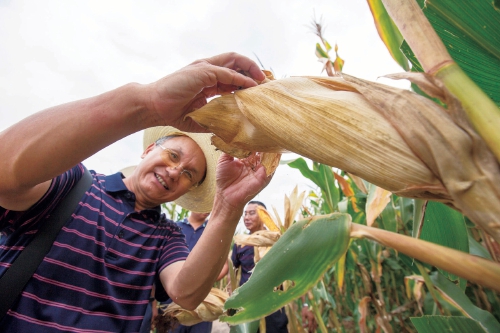圖為三峽農(nóng)科院副院長、二級調(diào)研員霍仕平在現(xiàn)場對玉米進行評審。