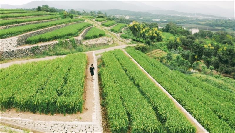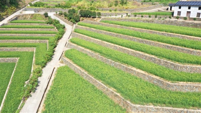 家門口的這座被當(dāng)?shù)厝朔Q為楊家屋后山的山坡,2019年實(shí)施墾造耕地50畝后,老許就在這里種上了水稻。第一年種的是普通水稻,“山地落差大、土層瘠薄,根本保不住水,差點(diǎn)顆粒無收。”老許擺擺手說道。