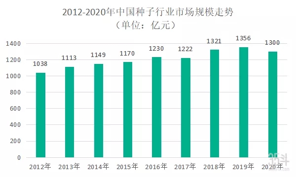 自種業(yè)進入市場化發(fā)展以來,我國種子行業(yè)的市場容量便不斷擴大。2012年國內(nèi)種子行業(yè)市場規(guī)模1038億元,到2020年種子市場規(guī)模達到了1300億元。