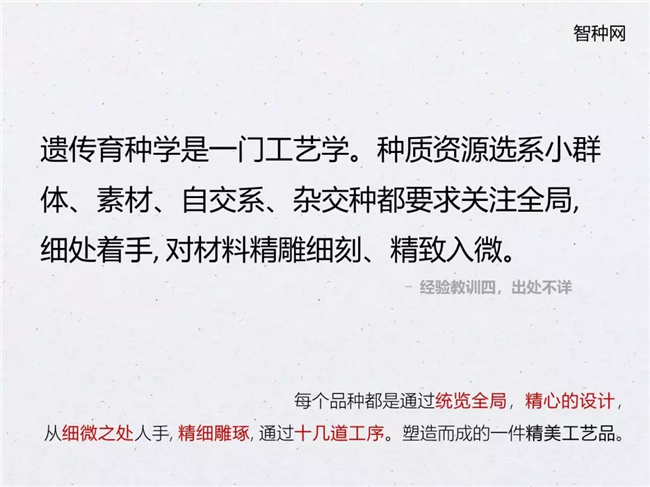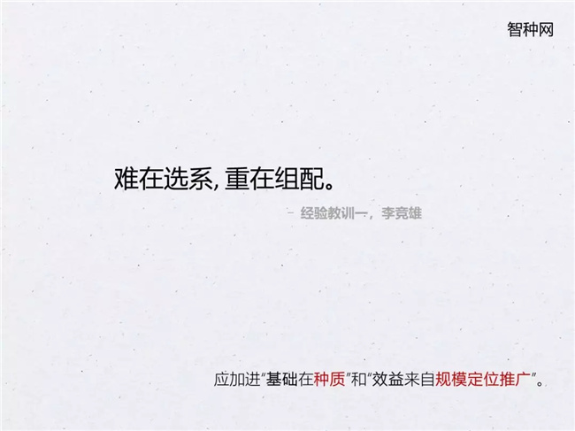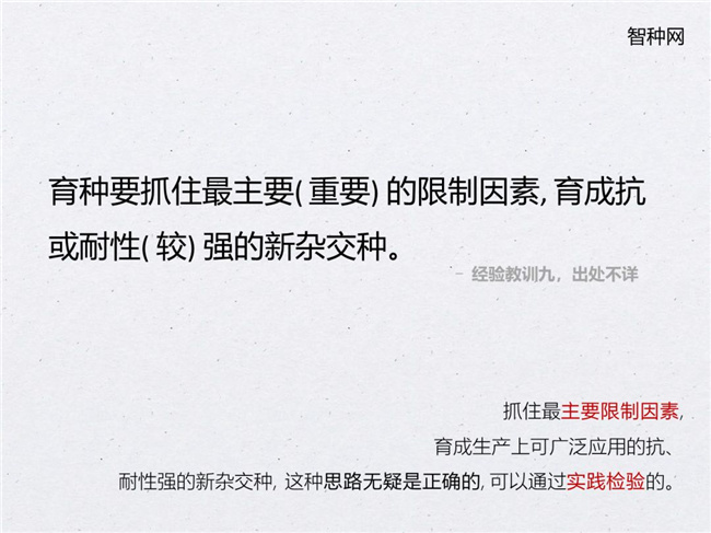 老一輩育種家在他們的育種過程中總結(jié)出了很多有用的經(jīng)驗(yàn),智種網(wǎng)整理出一些經(jīng)驗(yàn)同各位老師分享,比如李競雄先生總結(jié)的經(jīng)驗(yàn):難在選系,重在組配。又比如,育種要抓住最主要(最重要)的限制因素,育成抗或耐性(較強(qiáng))的新雜交種等等。