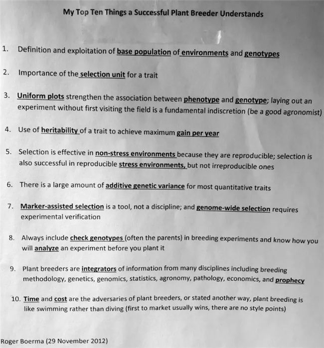 今天我們分享的是美國喬治亞大學(xué)的教授 Dr. H. Roger Boerma,他從事大豆育種達(dá) 40 年,自己總結(jié)了很多經(jīng)驗(yàn),其中最有名的是這育種十條原則。