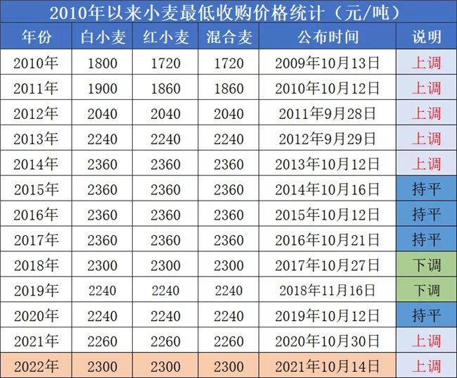 10月14日,國家發(fā)展改革委等公布2022年小麥最低收購價(jià)格的通知,經(jīng)國務(wù)院批準(zhǔn),2022年生產(chǎn)的小麥(三等)最低收購價(jià)為每50公斤115元,同比提高2分(圖表見文末)。