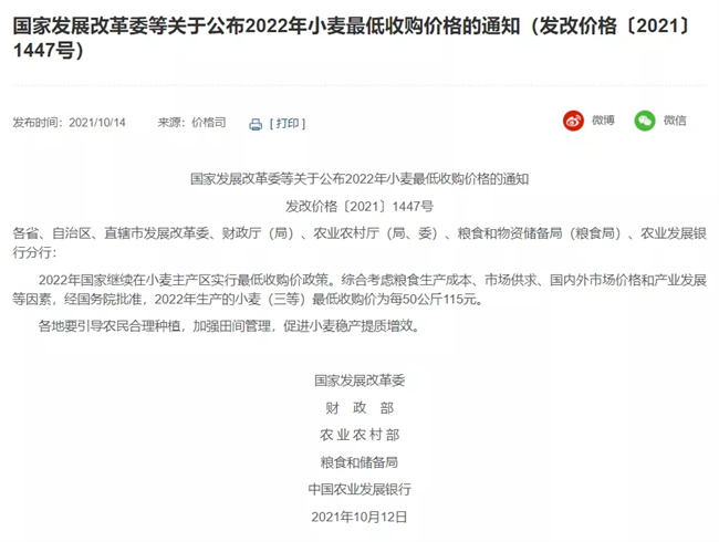 國家發(fā)展改革委等關(guān)于公布2022年小麥最低收購價(jià)格的通知
