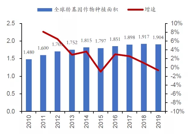 圖表2 全球轉(zhuǎn)基因作物種植面積及增速,億公頃