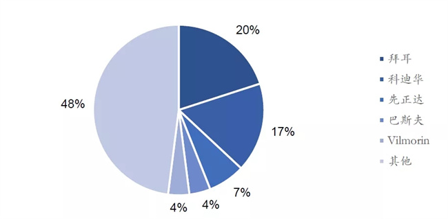 據(jù) Kynetec 數(shù)據(jù)顯示,2020 年先正達集團在全球種子行業(yè)市場占有率為 7%,排名第三,僅次于拜耳(20%)和科迪華(17%)。巴斯夫和 Vilmorin 以 4% 的市場份額分別位于第 4 名和第 5 名。
