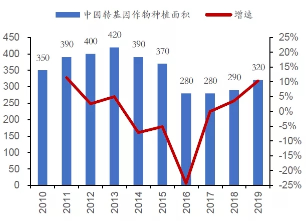 圖表3 中國轉(zhuǎn)基因作物種植面積及增速,萬公頃