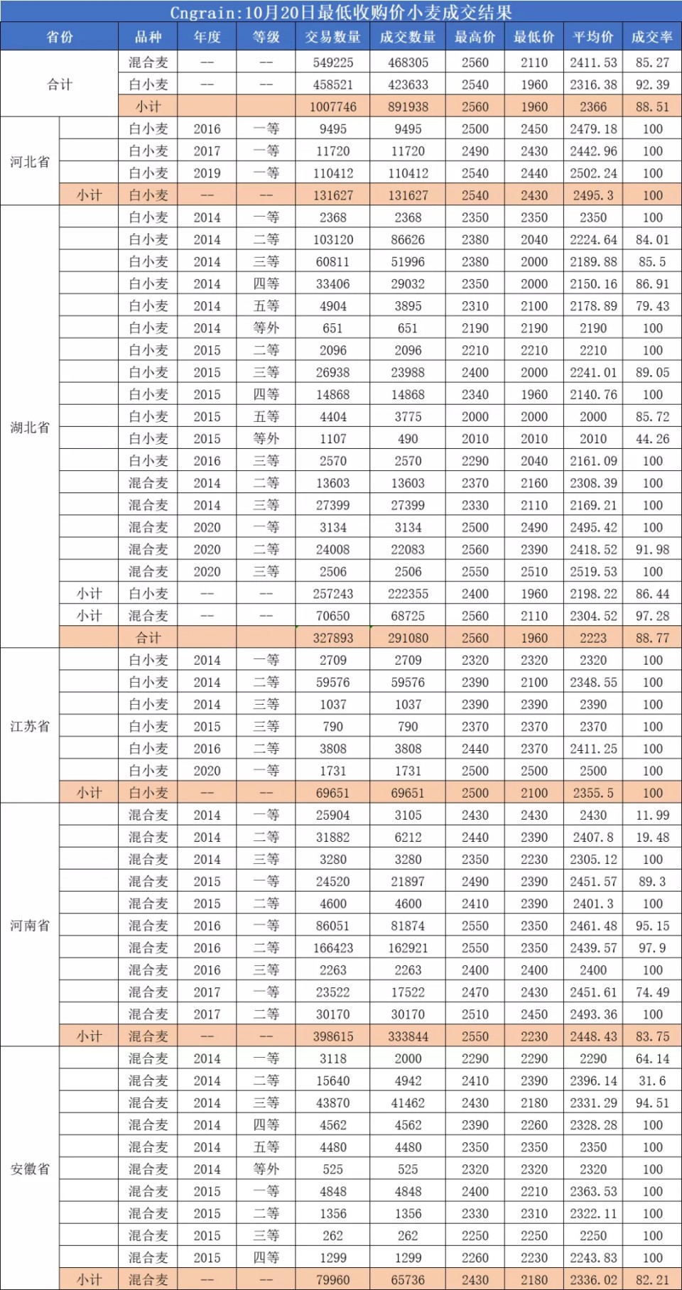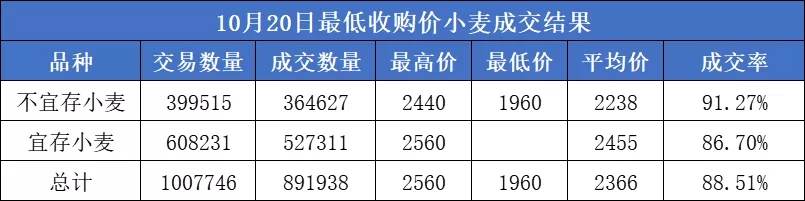 10月20日最低收購價小麥拍賣重啟,共計投放量100.77萬噸,實際成交89.19萬噸,成交率88.51%。