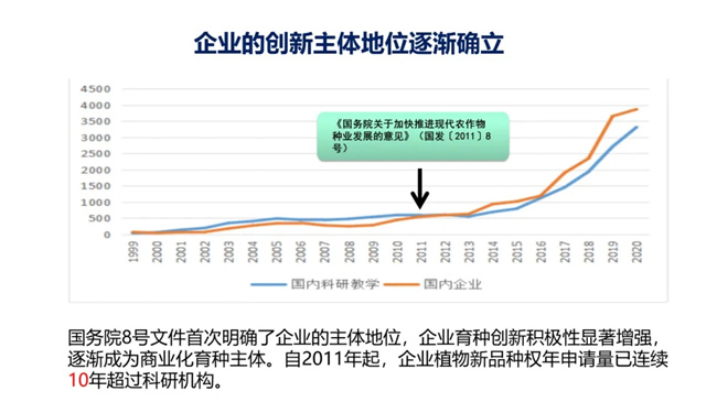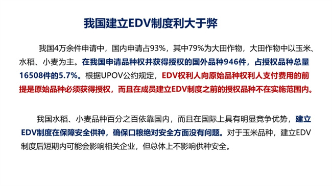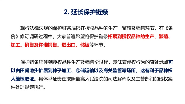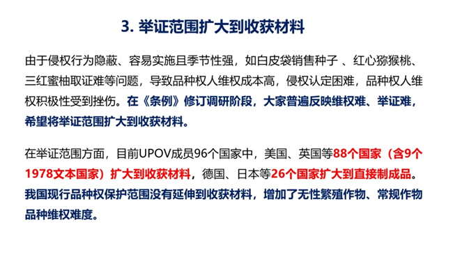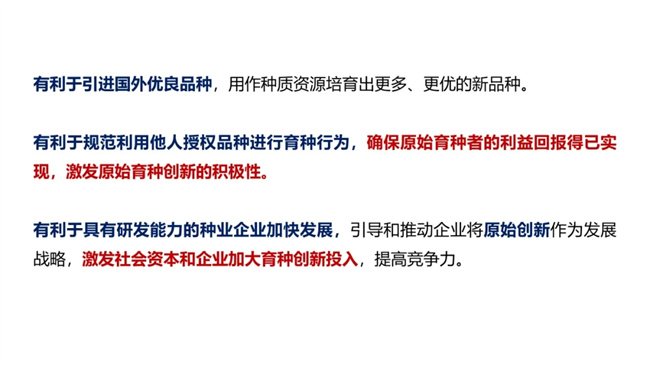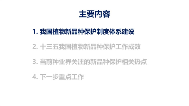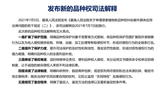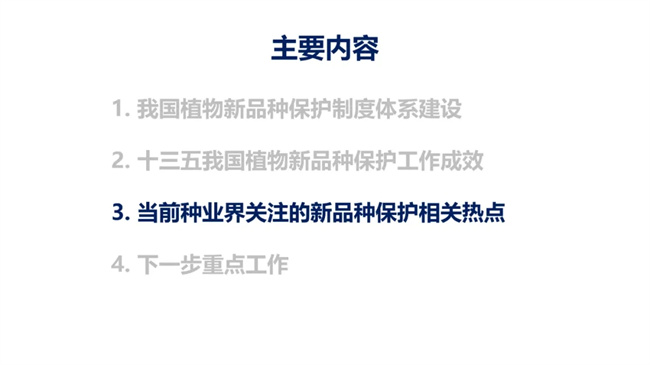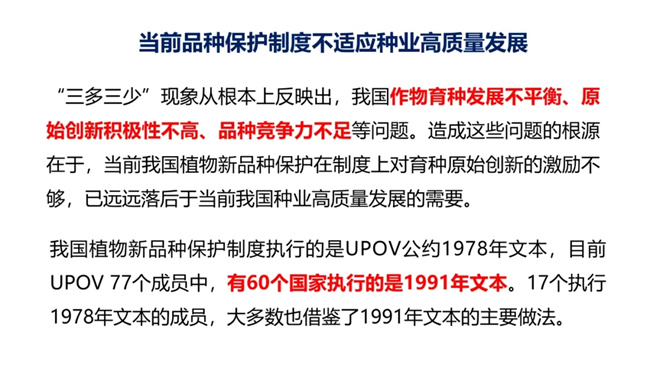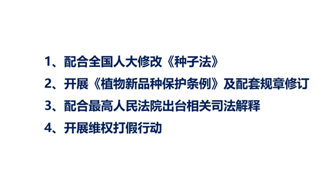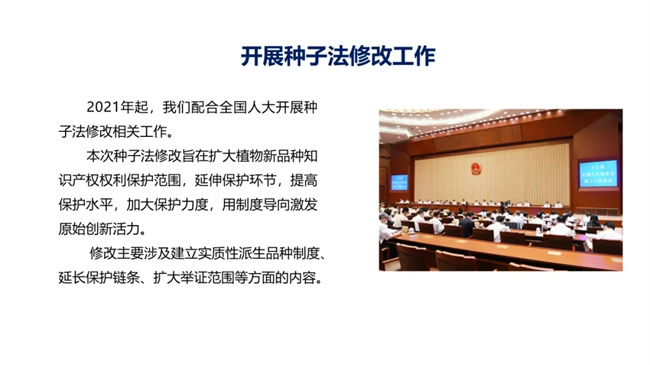 他指出,為加強我國植物新品種保護在制度上對育種原始創(chuàng)新的激勵,滿足當(dāng)前我國種業(yè)高質(zhì)量發(fā)展的需要,2021年起,啟動種子法修改工作,修改主要涉及建立實質(zhì)性派生品種制度、延長保護鏈條、擴大舉證范圍等方面的內(nèi)容。他表示,下一步,將開展《植物新品種保護條例》及配套規(guī)章修訂、配合最高人民法院出臺相關(guān)司法解釋、開展維權(quán)打假行動,加大對品種創(chuàng)新保護力度。報告詳細內(nèi)容如下: