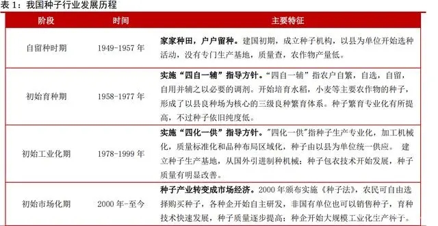 中國種子行業(yè)的發(fā)展始于建國初期。我國種業(yè)起步較晚,一直到新中國成立之后才得以 初步建立并緩慢發(fā)展。中國種業(yè)發(fā)展至今已有 70 余年,其中包括四個發(fā)展階段,分別是自留種時期(1949 年-1957 年),初始育種期(1958 年-1977 年),初始工業(yè)化期(1978 年-1999 年)以及初始市場化期(2000 年至今)。
