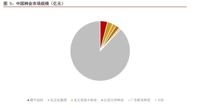 中國種業(yè)市場分散。根據(jù)全國農(nóng)業(yè)技術(shù)推廣服務(wù)中心和灼識咨詢統(tǒng)計數(shù)據(jù),2020 年中國種業(yè)市場 CR5 僅為 12%,遠遠低于全球市場集中度。市場份額靠前的企業(yè)主要包括隆平高科、先正達集團、北大荒墾豐種業(yè)、江蘇大華種業(yè)和廣東鮮美種苗。這幾大龍頭 2020 年中國市場份額分別僅為 4%、3%、2%、2%和 1%。